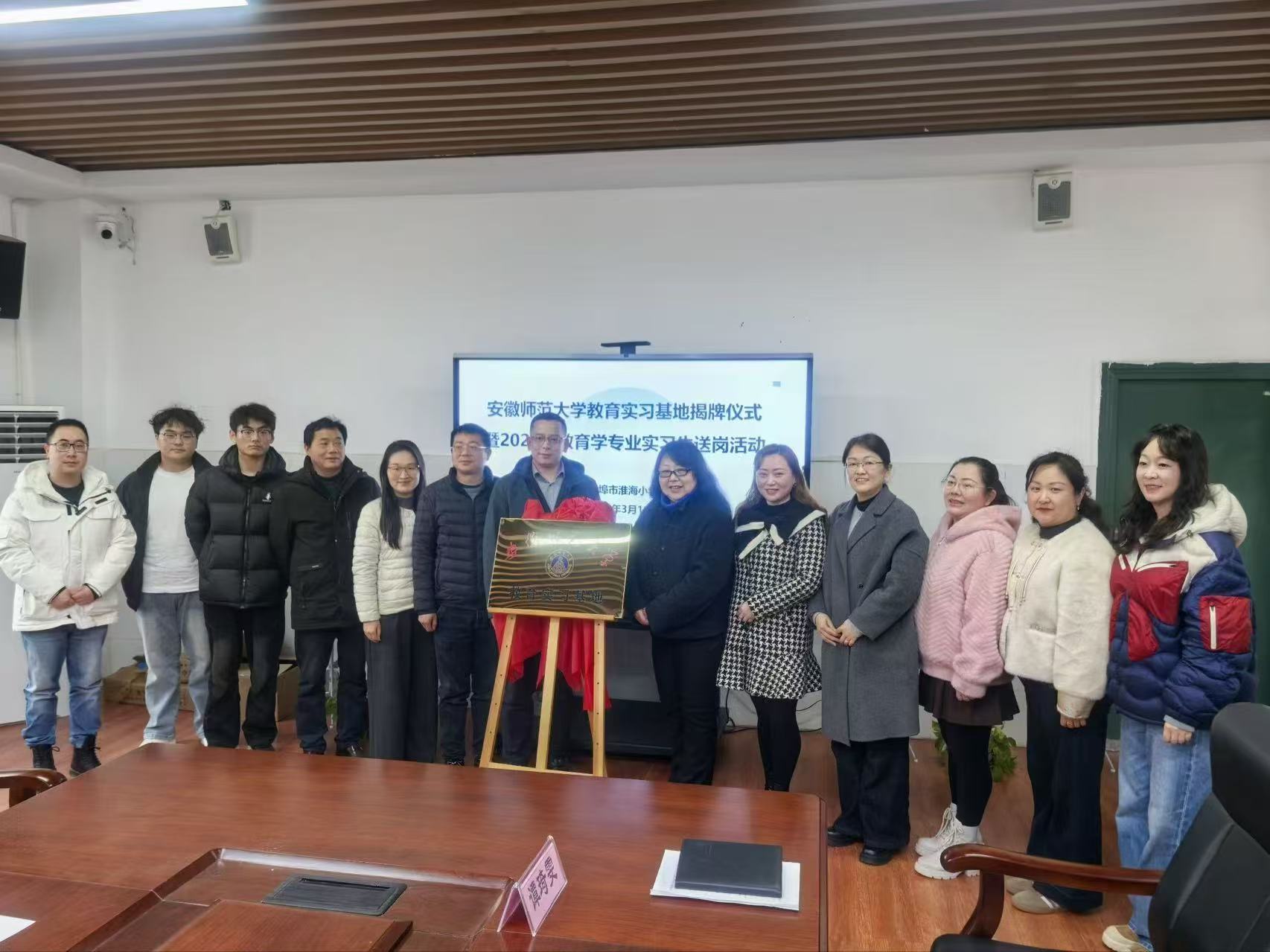 仪式最后,本科生院实践教育中心主任程啸天与淮海小学校长杨睿共同为安徽师范大学教育实习基地揭牌。与会代表一同合影留念,定格这一校地合作的重要时刻。