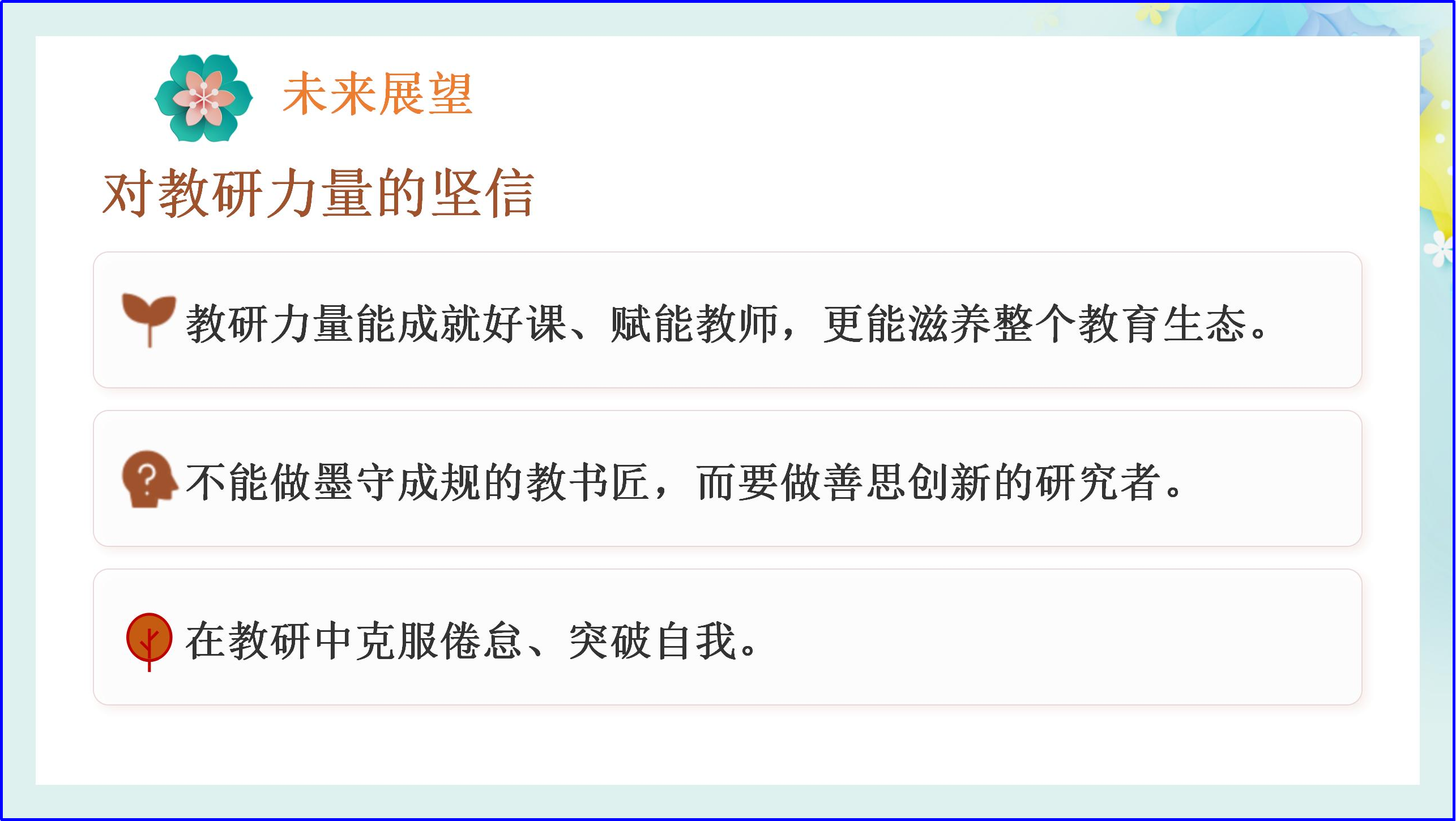 教育是慢修行,教研是坚实脚步。这几年指导青年教师上课赛课,我深知青年教师不易,他们非常渴望有团队在专业上精准指导。现在的我看着青年教师在台上绽放光彩,我更坚信:教研力量能成就好课、赋能教师,更能滋养整个教育生态。教育的每一天皆为崭新,唯有心怀使命与热爱,主动探索、勇于改变,才能拥有诗意的教育生活。我们不能做墨守成规的教书匠,而要做善思创新的研究者,在教研中克服倦怠、突破自我。“玉在山而草木润,渊生珠而涯不枯。”学校的教科研环境,是滋养教师成长的沃土。十五载匆匆而过,从一个人摸索到一群人同行,我始终铭记:教育初心是育人,教研本质是为了更好地育人。亚里士多德曾说:“教育的根是苦的,但其果实是甜的。”这份苦,是磨课的疲惫、挫折的迷茫;这份甜,是学生成长的惊喜、青年教师蜕变的欣慰。未来,我仍会带着对教材的敬畏、对教育的热爱,在磨课中成长,在教研中探索,让勤学、修德的种子在学生心中生根发芽,陪伴他们向阳而行。