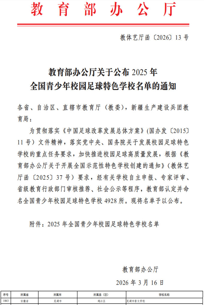 本次全国青少年校园足球特色学校遴选,严格按照《教育部办公厅关于开展全国示范性特色学校创建的通知》(教体艺厅函〔2025〕37号)要求,经过学校自主申报、专家评审、省级教育行政部门审核推荐、社会公示、专家复核等多道严格程序,旨在推动校园足球普及与提升,促进青少年身心健康全面发展。